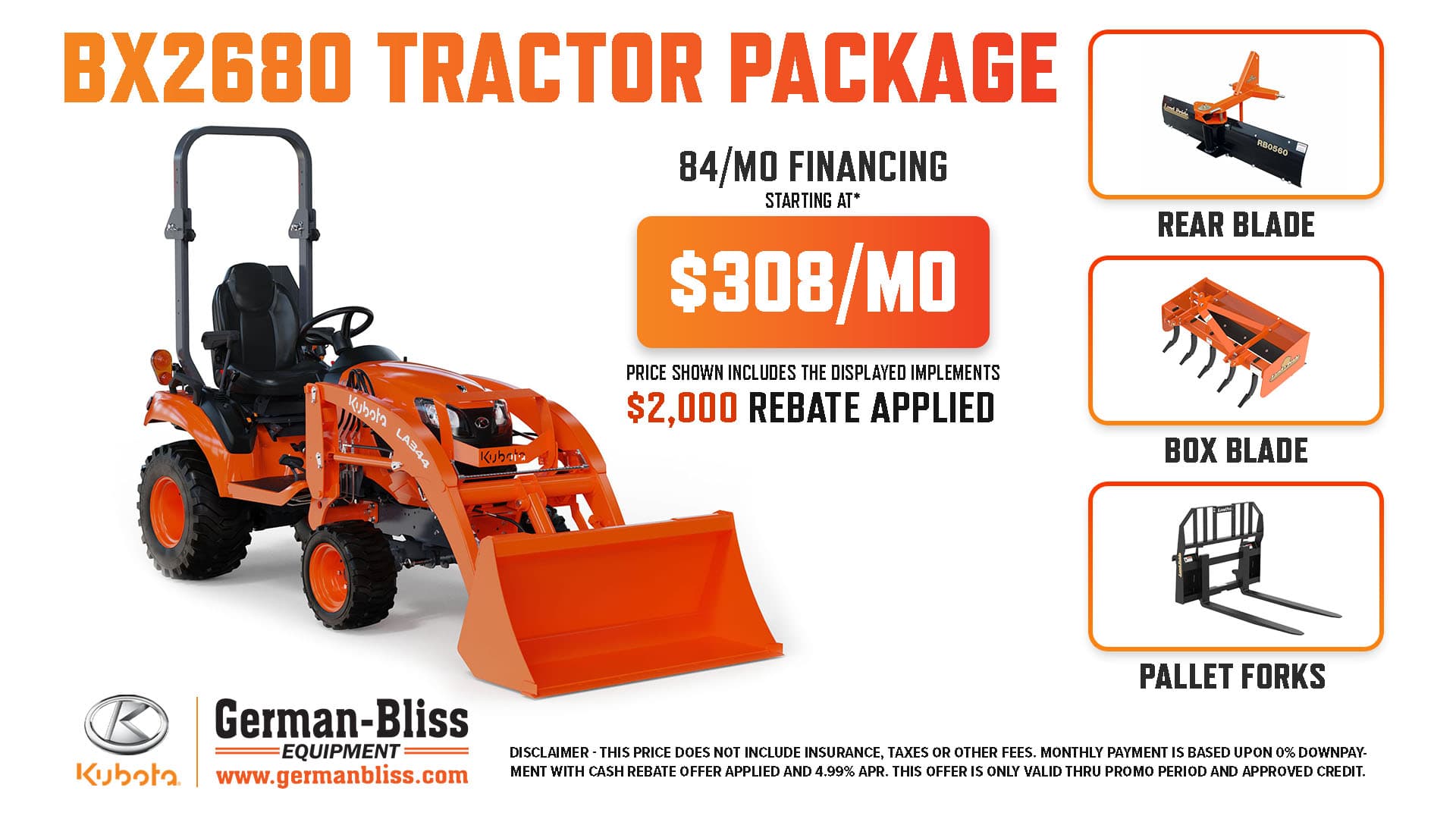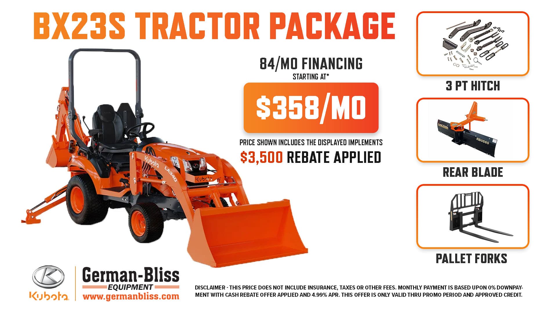 PRICES BELOW ARE CASH PRICES WITH ALL REBATES APPLIED.** ASK ABOUT KUBOTA'S LOW APR FINANCING PLANS TO GET THE BEST PAYMENTS. 4.99% Financing for up to 84 Months is available. Call for details and applicability. All sales are to be made in person.